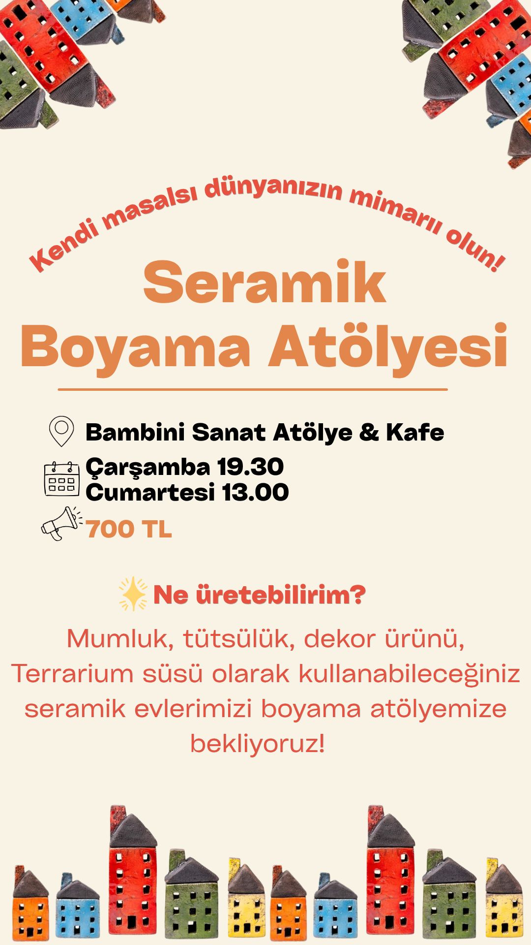 Bambini Sanat Atölye & Kafe'de düzenlenen atölyede mumluk, tütsülük ve küçük dekoratif seramikler yapıp boyuyoruz. Atölye hem çocuklara hem yetişkinlere uygundur ve adım adım rehberlik sağlanır. Kayıt için mekanla mesaj yoluyla iletişime geçebilirsiniz.
