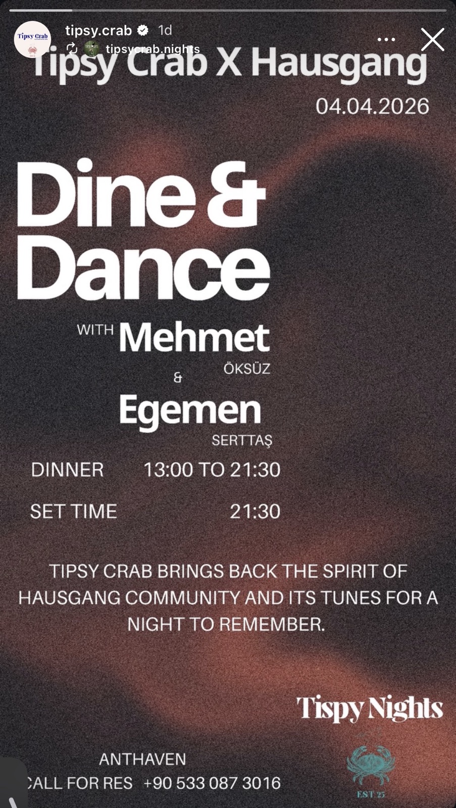 Bei einem von Hausgang inspirierten Dine & Dance-Abend verbinden sich Essen und Tanz mit Sets von Mehmet Öksüz und Egemen Serttaş. Das Programm beginnt mit dem Abendessen und entwickelt sich mit DJ-Sets bis in die Nacht. Es erwartet Sie eine entspannte und lebendige Atmosphäre.