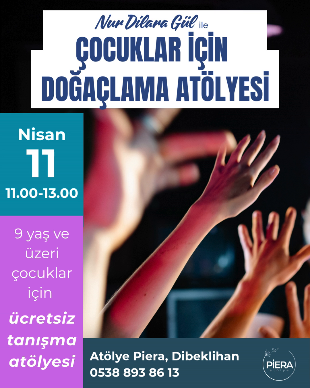 Çocuklara yönelik bu atölyede oyun tabanlı doğaçlama egzersizleriyle ifade ve yaratıcılık geliştirilir. Katılımcılar küçük grup çalışmalarıyla temel teknikleri deneyimler ve sahneye çıkma cesaretini destekleyen etkinlikler yaparlar. 9 yaş ve üzeri çocuklara uygundur.