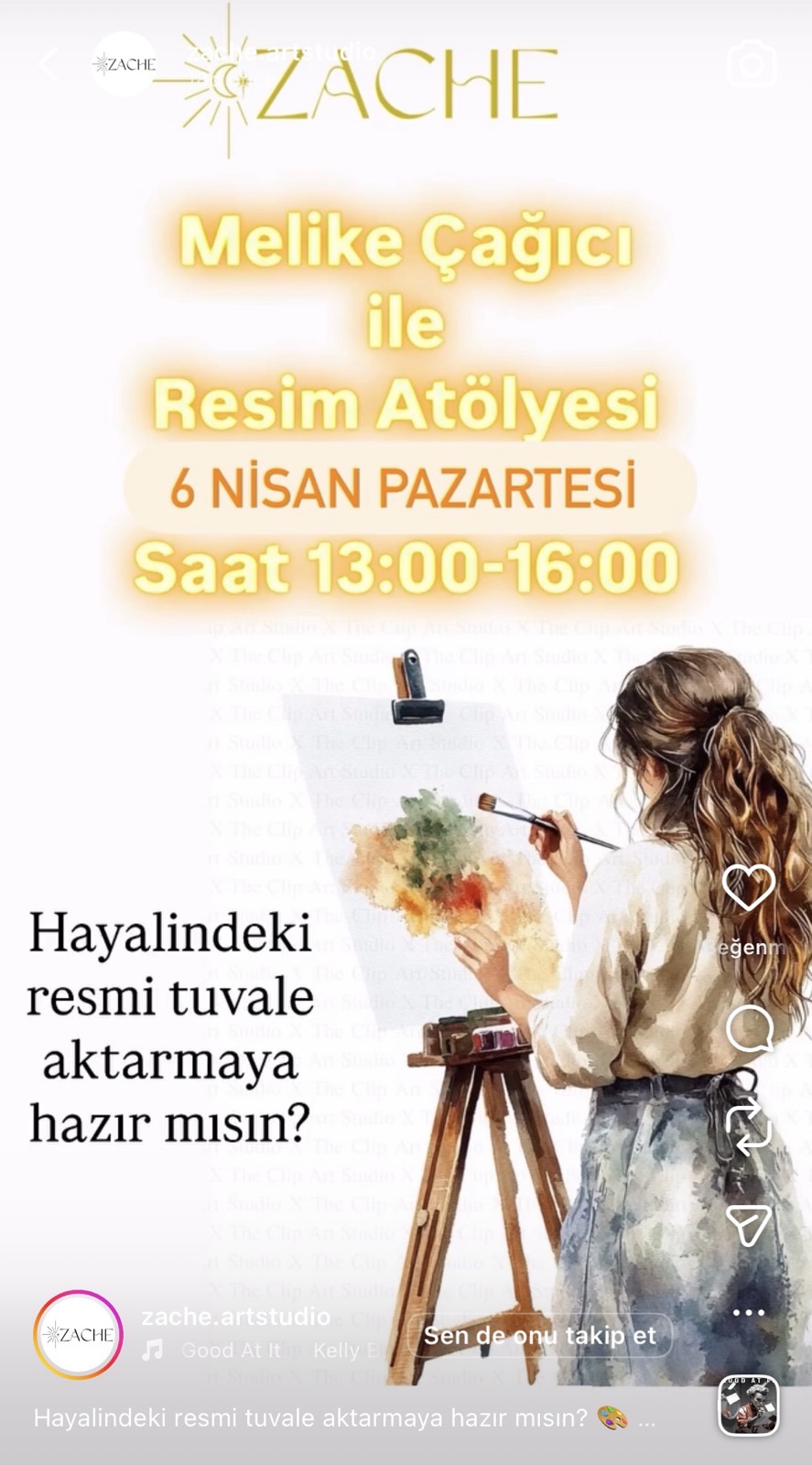 Melike Çağici eşliğinde düzenlenen uygulamalı bir resim atölyesi. Atölyede temel teknikler öğretilir ve katılımcılar kendi tuval çalışmalarını yapar. Her seviyeden katılımcıya açıktır ve yaratıcı bir çalışma ortamı sunar.