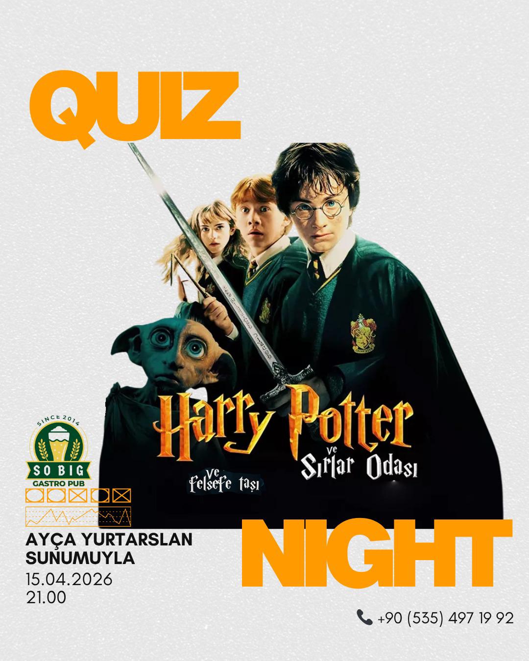Ayça Yurtarslan sunumunda Harry Potter temalı bir quiz gecesi. Felsefe Taşı ve Sırlar Odası temalarından derlenen sorularla takım halinde yarışıp eğlenceli bir bilgi oyunu deneyimi yaşayabilirsiniz. Her seviyeden katılımcıya uygundur ve arkadaş grupları için ideal.