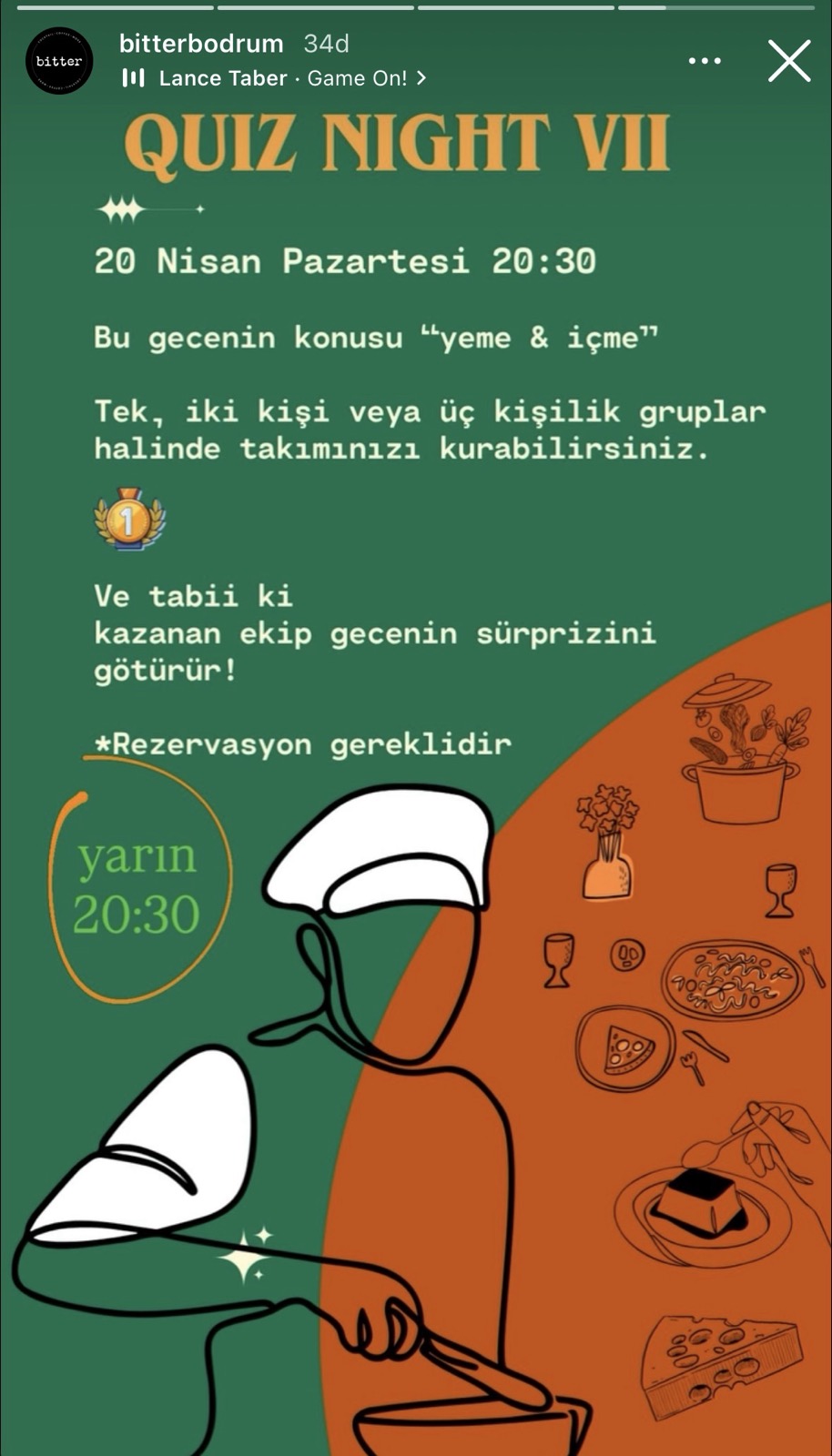 Gece boyunca takım olarak soruların yarışıldığı, eğlenceli bir bilgi yarışması. Bu hafta gecenin teması "yeme & içme"; tek, iki veya üç kişilik gruplarla katılabilirsiniz. Kazanan ekip gecenin sürpriz ödülünü alacak, rezervasyon önerilir.