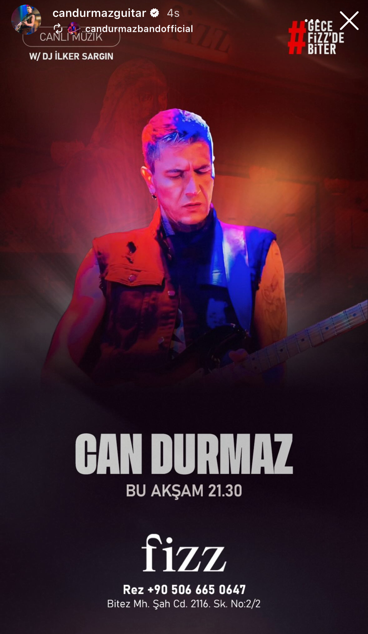 Fizz Bitez, bu hafta Can Durmaz ile canlı müzik keyfini yaşatıyor. Eğlencenin adresi olan mekanda, her gün farklı müzik performanslarıyla dolu bir atmosfer sizleri bekliyor. Rezervasyon ve detaylı bilgi için +90 506 665 06 47 numarasını arayabilirsiniz.