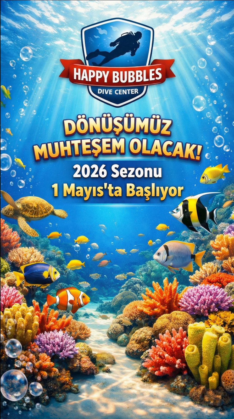 Bodrum'da 30 yılı aşkın süredir hizmet veren Happy Bubbles Dalış Merkezi, 2026 sezonunu 1 Mayıs 2026 tarihinde açacak! Sizlere "arkadaşça, keyifli dalışlar" sunmaya devam edeceğiz. İster sertifikalı dalgıç olun isterseniz daha önce hiç deneyimlememiş olun; herkes için uygun bir program var. Uluslararası geçerliliği olan ve ISO standartlarda yapılan SSI - Scuba Schools International eğitim sistemimizle sıfırdan başlayıp eğitmen seviyesine kadar gelebileceğiniz programlarımız için bizlerle iletişim kurun. Hemen!